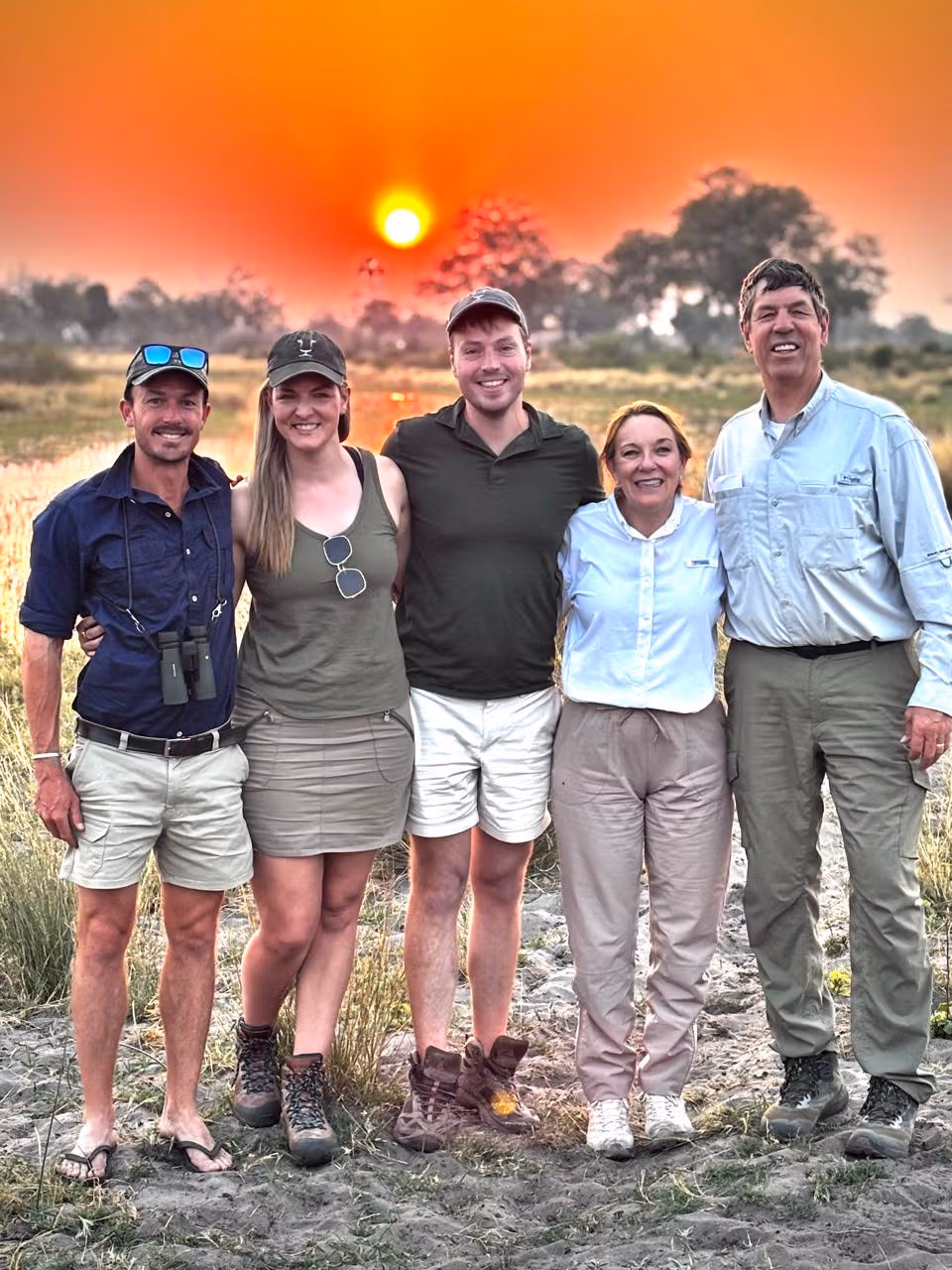 Later, we waved goodbye to our wildebeest friends - Simon, Peeping Tom, and the rest of the San Camp crew - and made our way to Maun to begin the next leg of the journey. Our path shifted north-east, into the green veins of the Okavango Delta. For Patrick and Suzanne, the helicopter ride was their first “flip,” as Roan called it. From the air, the Delta was a revelation. Hippos carved channels like veins, pushing water into new paths. Elephants lumbered across the plains. Giraffes stretched toward the trees. For twenty minutes, we floated over paradise - and then dropped down into the wild heart of it.