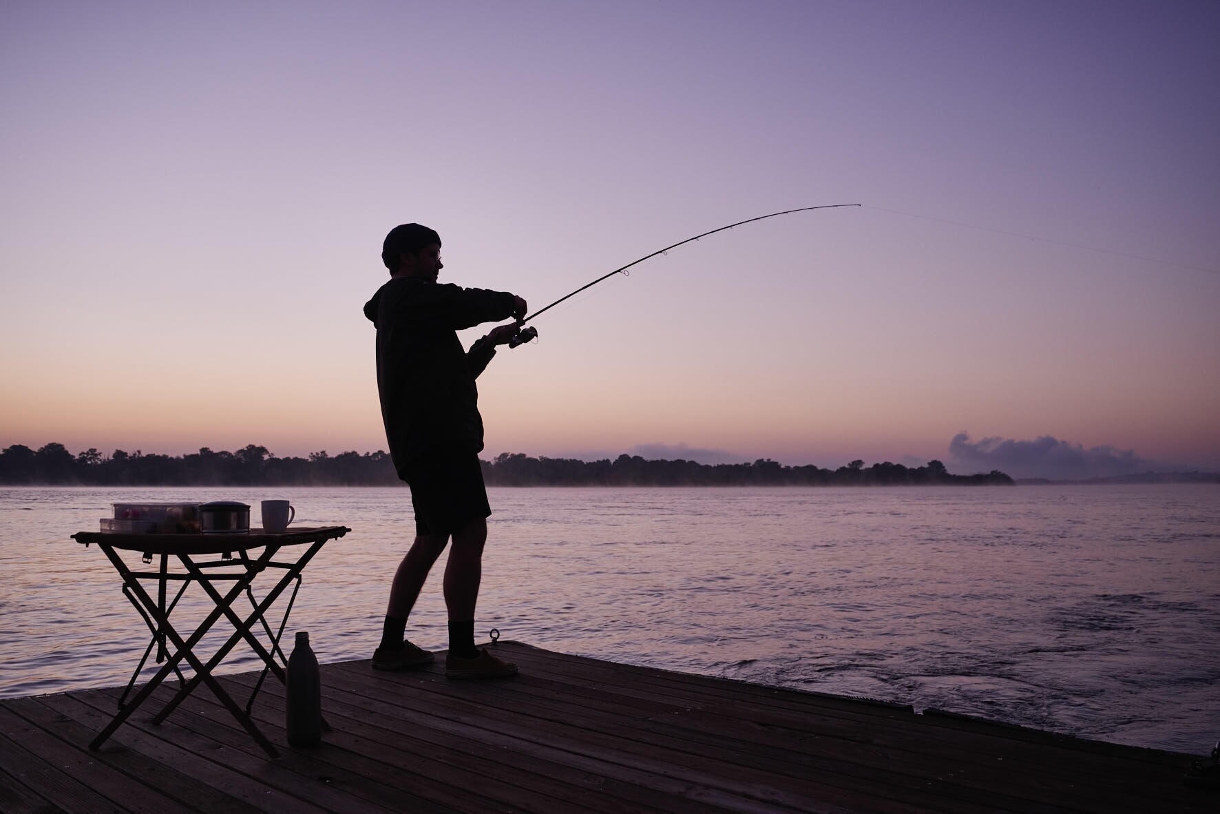 I like remembering this. It justifies my thoughts being focussed on faraway blueness instead of fishing. My mind is apparently naturally philosophical, its flights of fancy have nothing to do with the fact that killer crocs don’t live in those lovely safe mountains. But Kathy is fully present and fully focussed on fishing. She has a tug on her line that links her human hand to an animal soul in the invisible depths and, within a few skilful minutes, she brings her tiger fish in. Her smile, so wide, so joyous, is its own world axis; it tugs us all in.