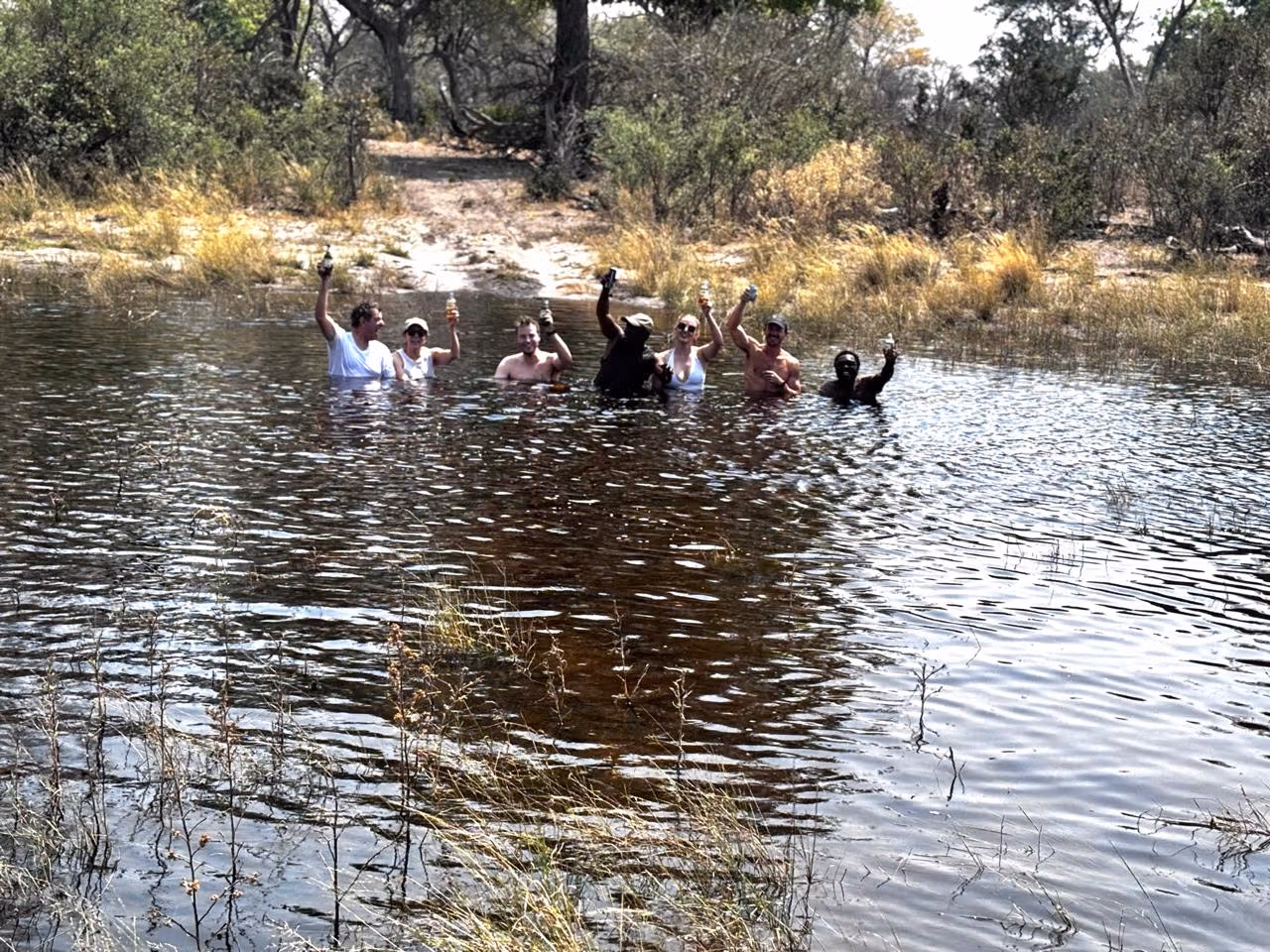 By midday, the sun pressed down hard. Ace grinned and said something I thought was a joke: “Jump in.” I looked at the water, skeptical. But he assured me that hippos and crocs stick to the deeper pools. Roan and Ace waded in first, and I followed. The water was warm, the sand soft as silk. That quick dip left me feeling refreshed as we headed back to camp.